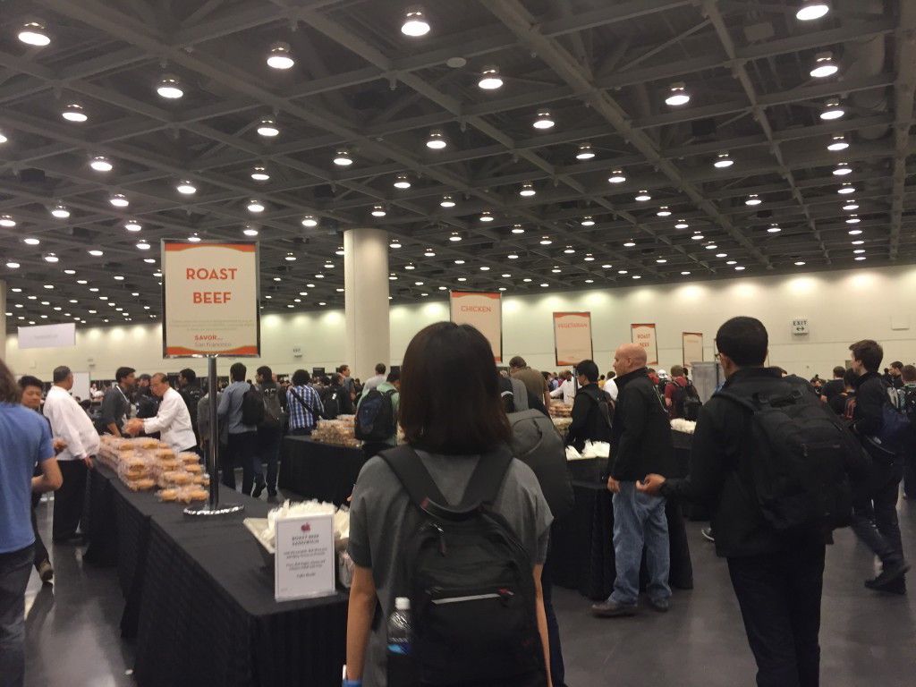 周一到周五是有午餐提供的,但是虽说是午饭,对于我们天朝大吃货国出来的人来说可以用难以下咽来形容。每天选择很少,而且很固定,基本就是在烤牛肉三明治,烤鸡三明治以及猪肉三明治 (差点忘了,还有为素食主义者提供的蔬菜三明治) 之间进行选择。一般第一天 Keynote 以后大家都还是会选择在会场吃个饭,顺便可以下载 beta 版的 Xcode 和 iOS。但是之后几天的话,会有一些开发者选择出去吃饭。Moscone West 出门 4th Street 对面就有很多吃饭的地方,顺着 Howard St 往下稍微走个五分钟也有不少餐馆,如果你对吃的比较追求的话可以去试试。