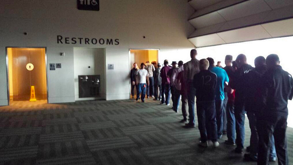 虽然有不少报道说会场的厕所会变成这个样子,但是实际上来看其实还好,并没有那么夸张。第一天的 Keynote 因为从排队,到开场,再到结束,会花费很长时间,Keynote 结束以后可能会比较悲惨一些。所以建议尽量在 Keynote 之前找机会解决一下,或者就少喝一点水,这样能减小到时候尴尬的可能性。