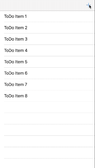 举一个非常简单的 View Controller 的例子。假设我们有一个 Table View Controller 来记录 To Do 列表,我们可以通过点击导航栏的加号按钮来追加一个条目,用 Swipe cell 的方式删除条目。我们希望最多同时只能存在 10 条待办项目。这个 View Controller 的代码非常简单,可能也是很多开发者每天会写的代码。包括设置 Playground 和添加按钮等等,一共也就 60 行。我将它放到了这个 gist 中,你可以全部复制下来扔到 Playground 里查看效果。