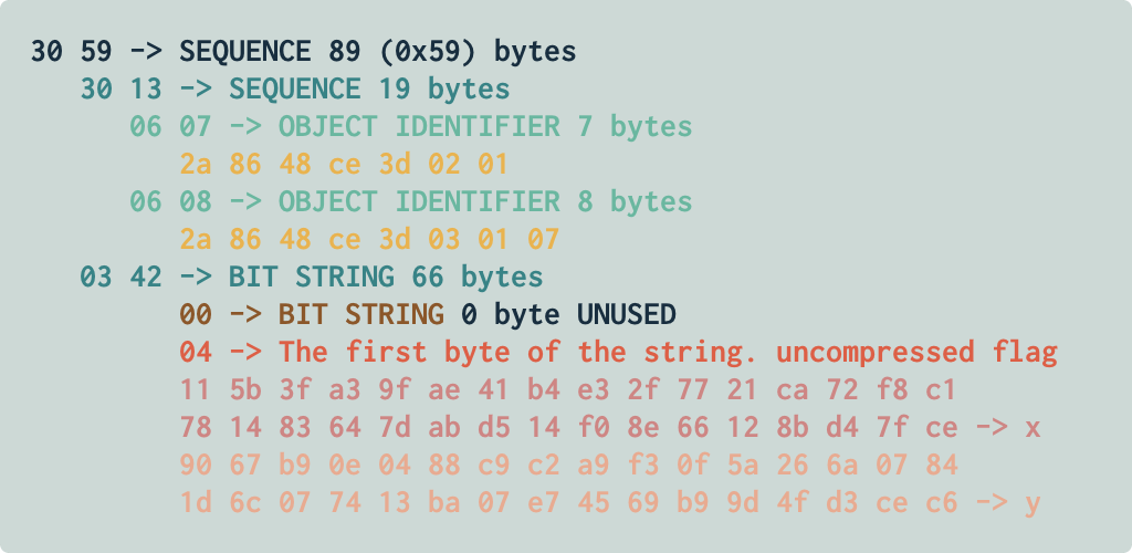 有了这些基础知识,我们可以来看看本文一开始例子中的 ECDSA 公钥的二进制里都是些什么内容了: