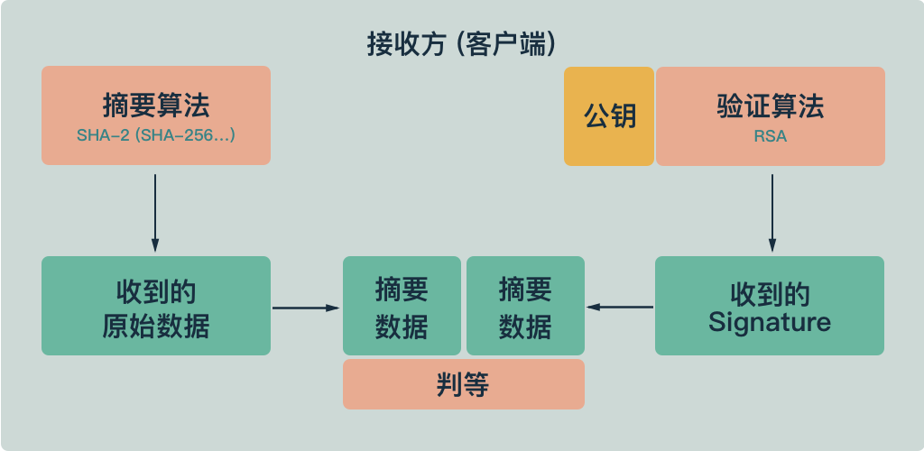 注意,上面的图是 RSA 算法的情况,对于 ECDSA 来说,流程稍有不同。ECDSA 在验证时并不是把收到的 Signature 还原成摘要数据,然后进行对比。ECDSA 的 Signature 是由两个大数组成 (通常写作 {r, s}),通过 Signature 中的整数 s,以及收到的原始数据所计算出的摘要,可以计算出另一个整数 v。如 r 和 v 相等的话,就认为验证通过,否则失败。
