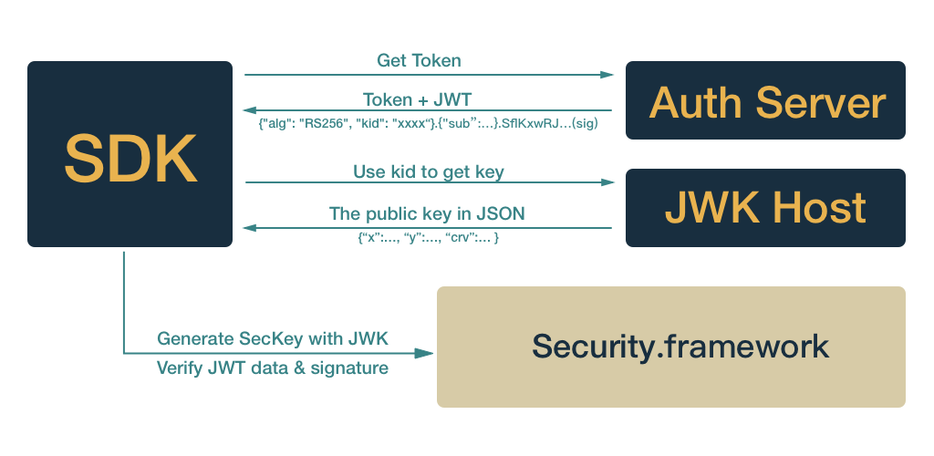 第一步,从 Auth Server 获取 JWT,并完成解析,是很简单的事情。最后一步,将 JWK 转换成 Security 框架中的密钥,并且对 JWT 的数据进行验证,我们在详细了解了密钥和签名/验证的知识以后,大概也能解决。剩下的问题是中间的框图:我们应该去哪儿寻找 JWT Header 中定义的公钥?