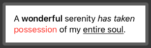 Text("A \(bold: "wonderful") serenity \(italic: "has taken") \("possession", color: .red) of my \(underline: "entire soul").")