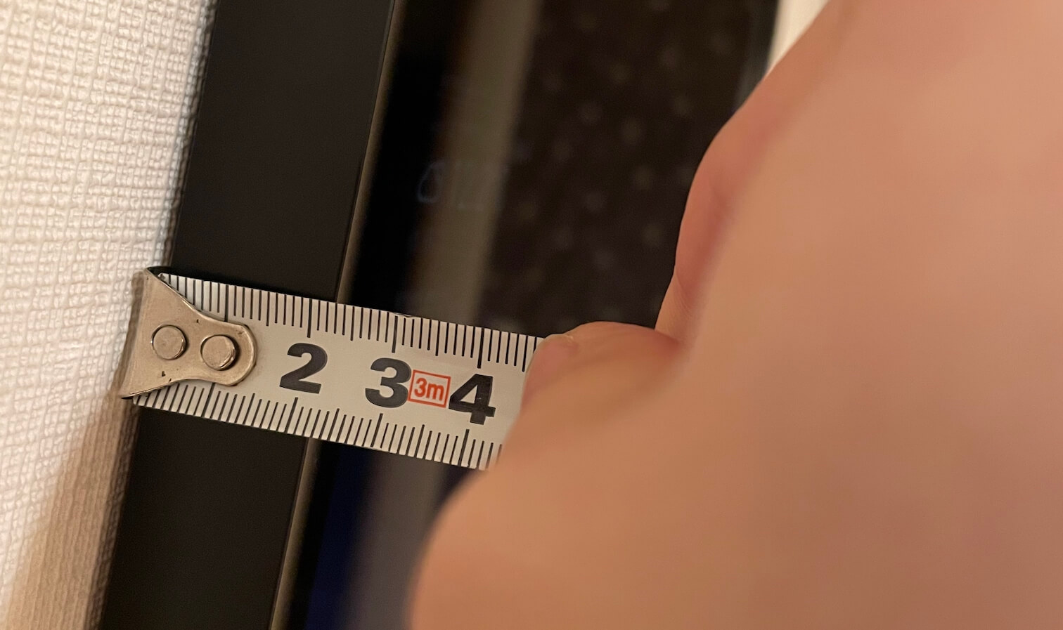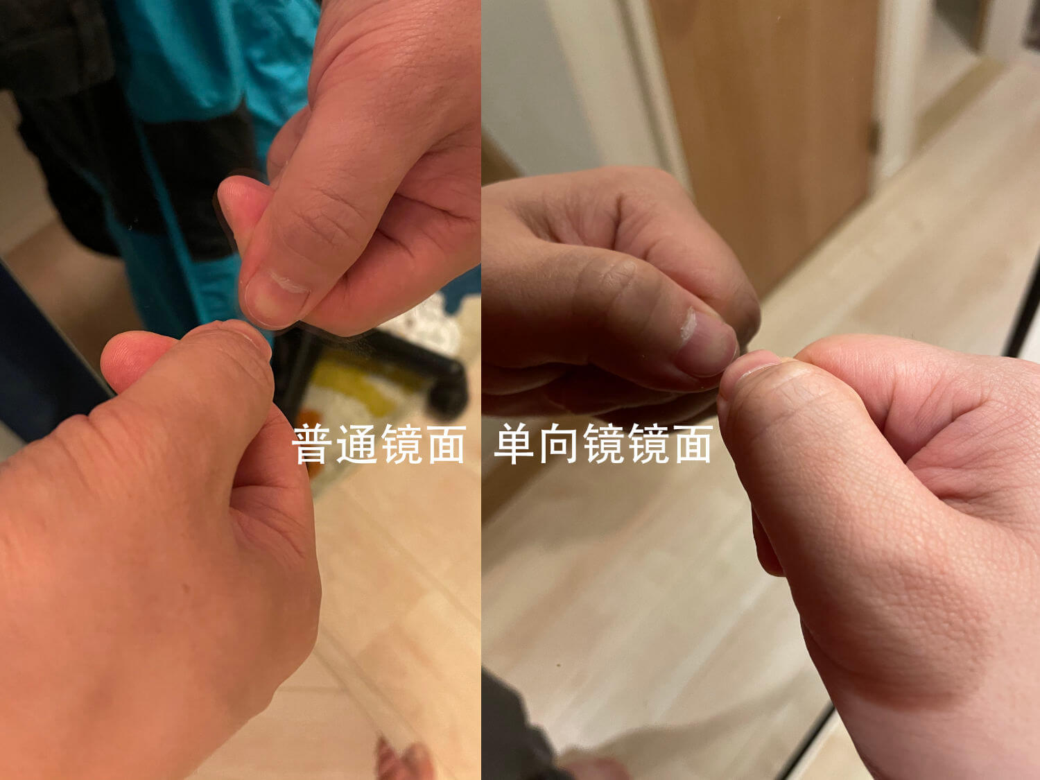 虽然单向玻璃的镜面两边都是存在反射和透射的,但是因为膜的位置会导致两面的性能不太一致:在有膜面我们能得到更多的反射率,这样会让成品有更好的镜面表现。简单来说,我们可以通过指甲接触镜面来判断是哪一面朝外:玻璃面的话,由于反射部分在玻璃后方,所以指甲尖是不能触碰到镜中虚像的;而膜面的话指尖可以直接贴到: