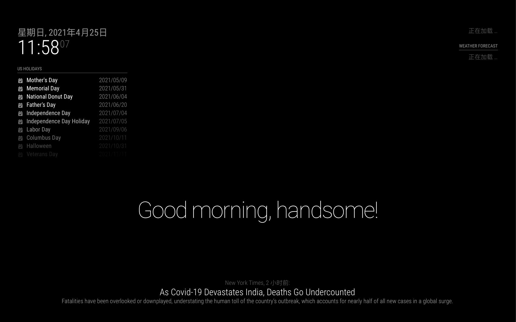如果一切正常,连接在客户端的显示屏上应该就能够看到 MagicMirror 的内容了。