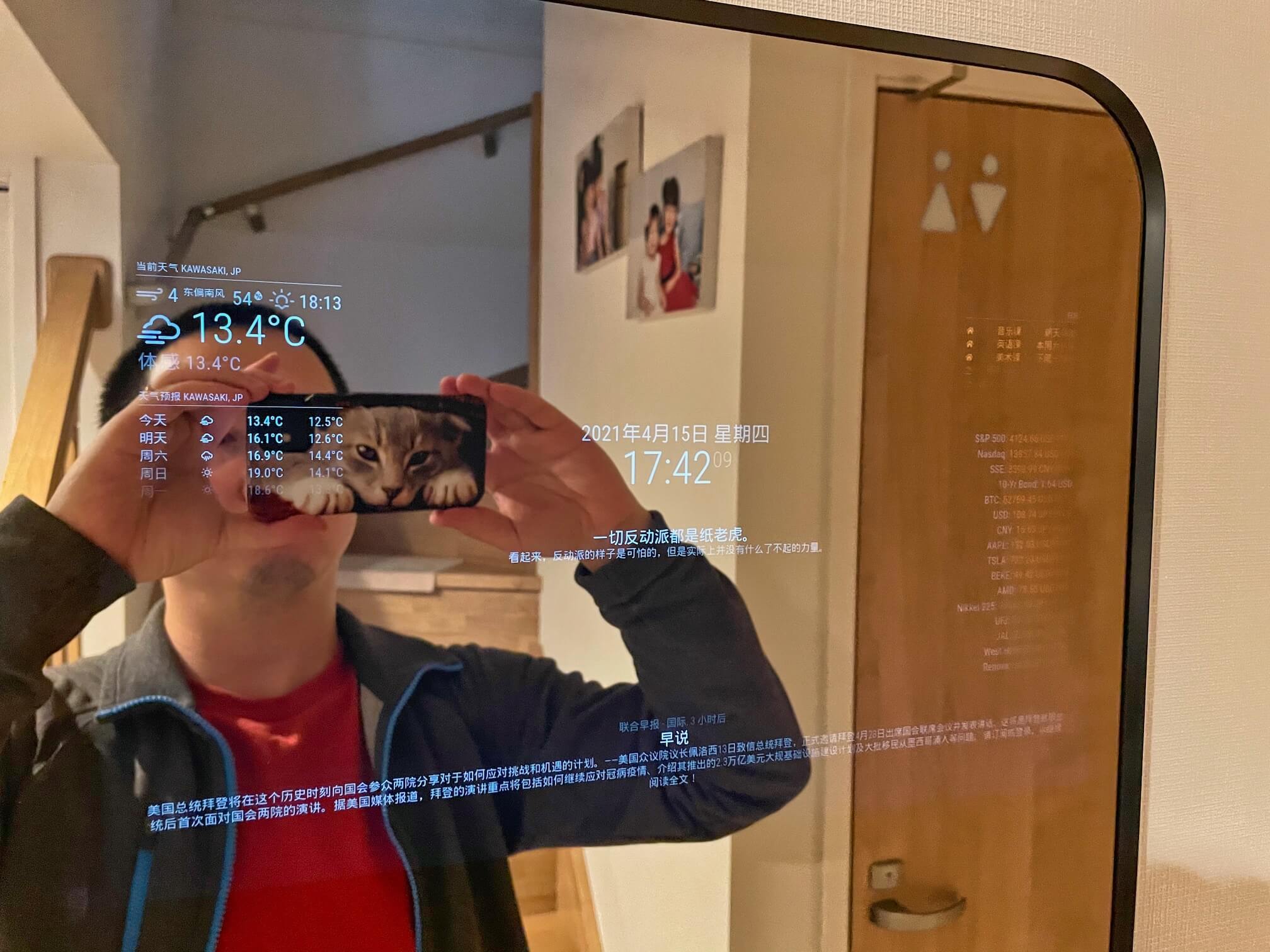 本来买了一个树莓派打算架个 Nextcloud,实际弄好以后发现并不是很用得上。眼看新买的树莓派就要沦为吃灰大军中的一员,实在不甘心。正好家里有一面穿衣镜,趁机改造一下,做成了一个 Magic Mirror,最终效果如下。