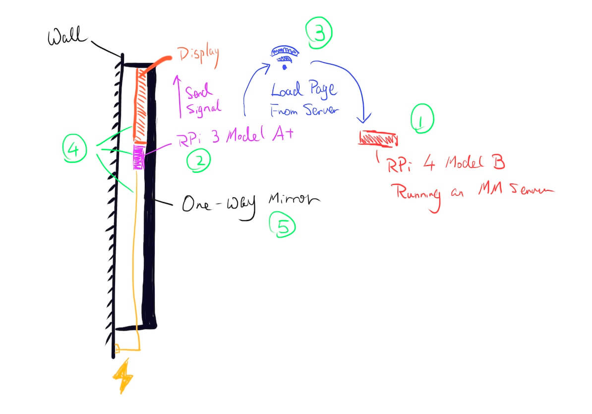 另外如果镜子背后的空间比较大,能够上至少 1GB 内存的 Model B 级别的设备的话,其实就不需要采用服务端和客户端分离的做法,软件安装上就会简单许多。但是厚的镜框也会带来反射率不足的问题,也许效果会有所折扣。