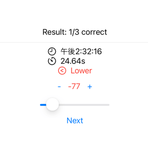 举例来说,如果第一个数字是 10,我们在按下 “Next” 之前已经让 counter 变成了 10,且耗时 5 秒,那么我们需要记录 GameResult(secret: 10, guess: 10, timeSpent: 5.0);对于没有猜对就继续的情况,我们也用同样的类型记录下来。记录的结果保存在 GameState 的一个数组中: