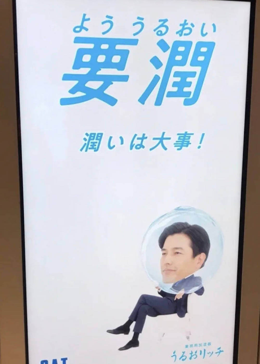 某车站边上的加湿器广告。虽然演员要润的名字和“大事”这个词在中日文环境中的意义不同,但大环境下这个广告在中文互联网上一度成了热点。