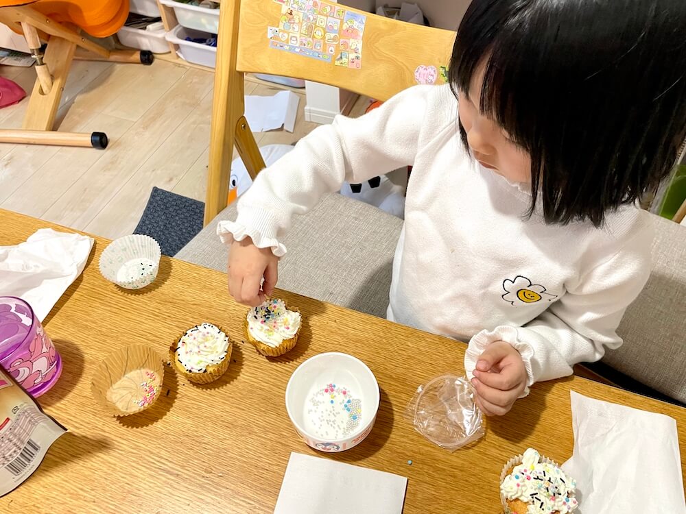 在家招待自己的小客人们,七七帮忙制作杯子蛋糕。