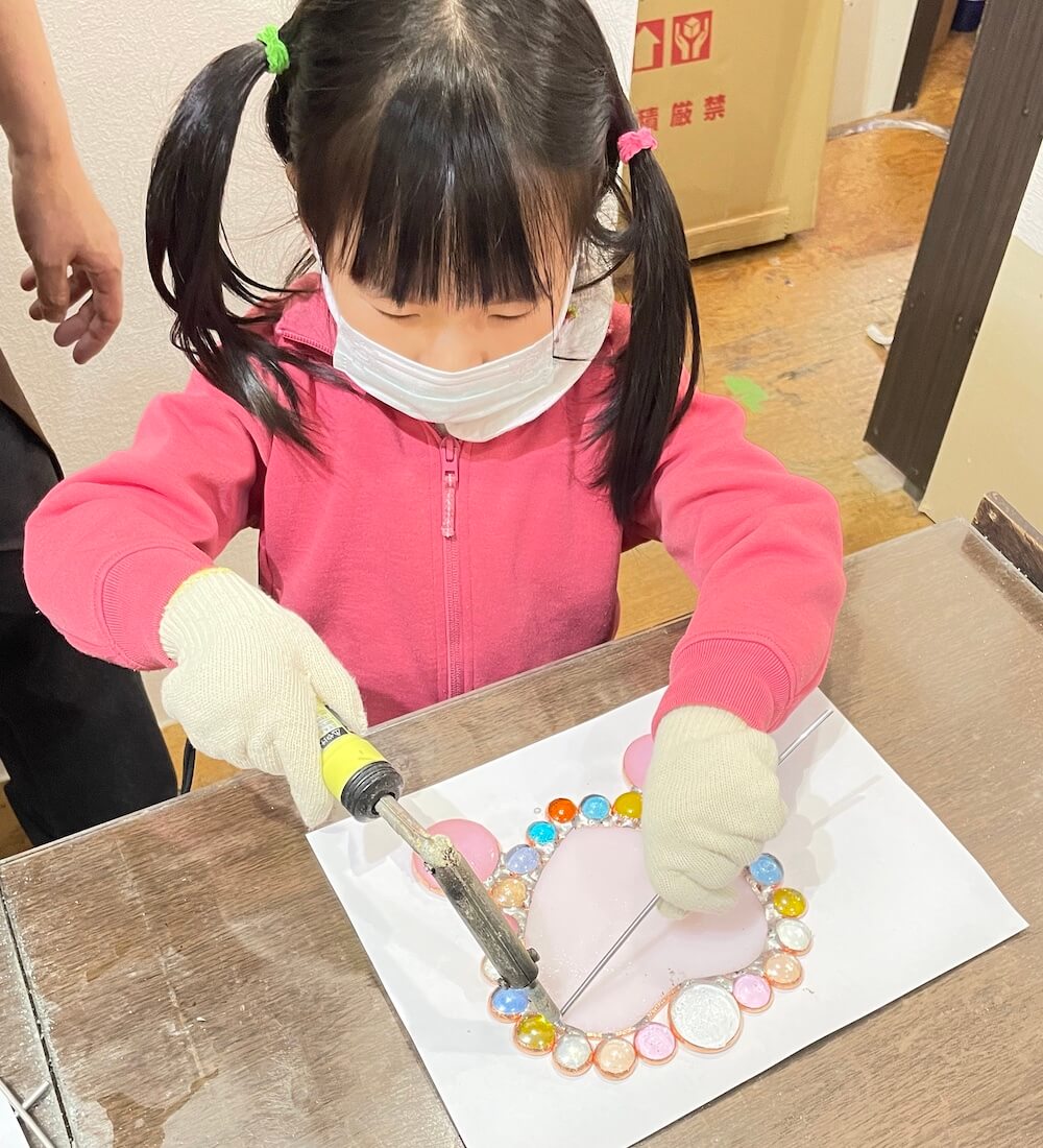 某酒店的手工制作工房,七七正在参加玻璃时钟的制作体验,电烙铁拿得有模有样。