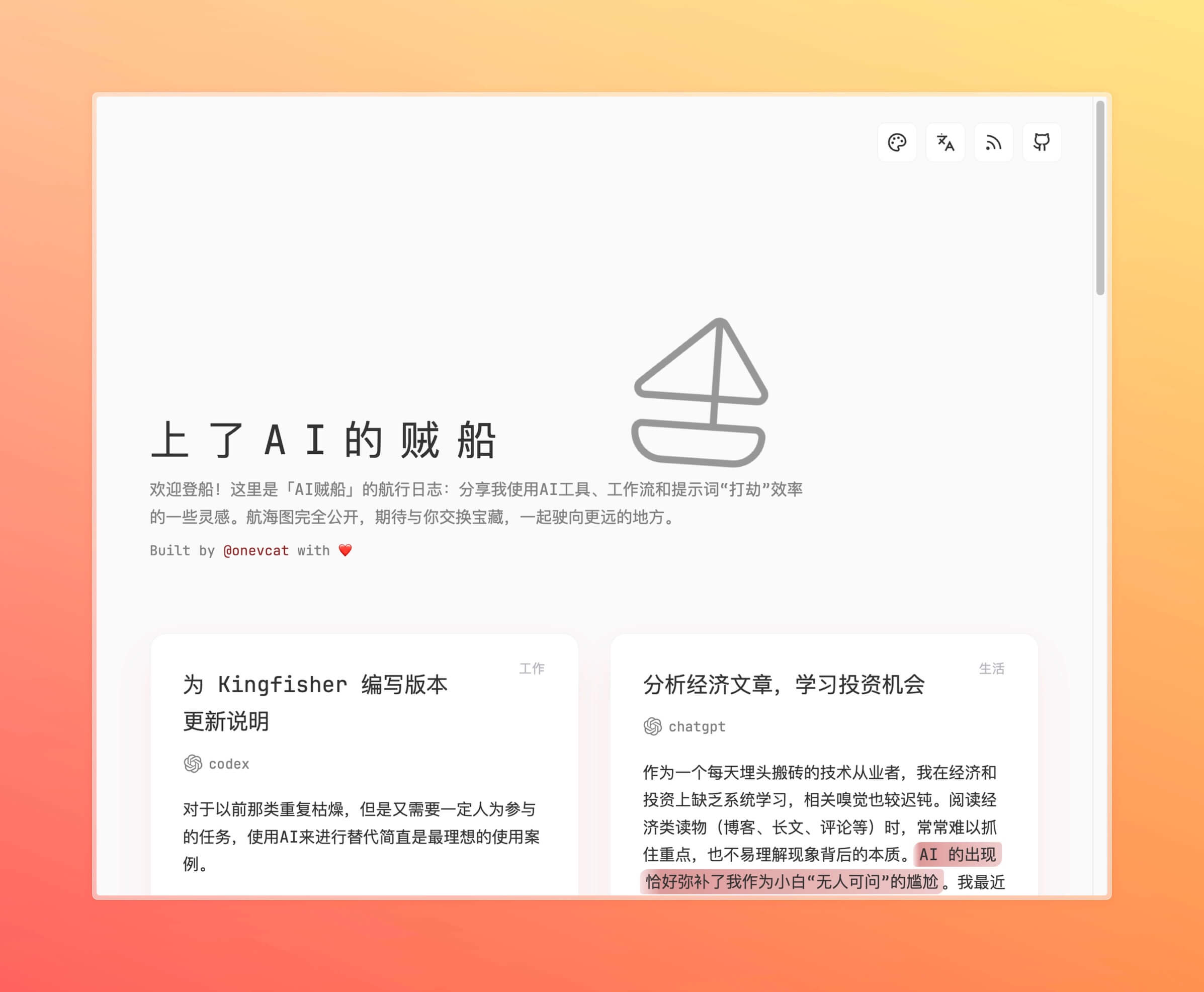 其次是一个更简单一些的静态页面「上了AI的贼船」。我会不定期在这个页面分享我在使用 AI 工具进行日常开发,生活和娱乐等方面的心得以及实际的使用案例。在 build 时,我使用中文书写的内容会通过 LLM 自动翻译成其他支持的语言;当然,深浅颜色切换,feed 订阅这些基本要素也都完备。