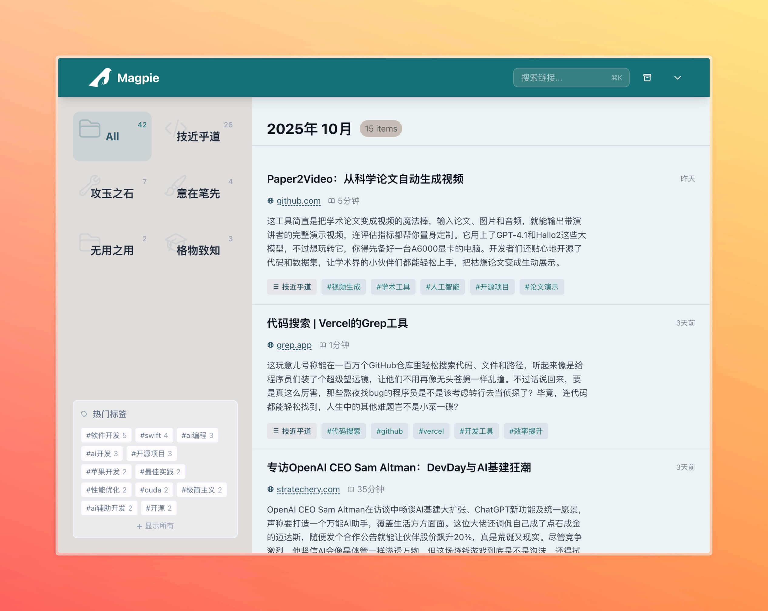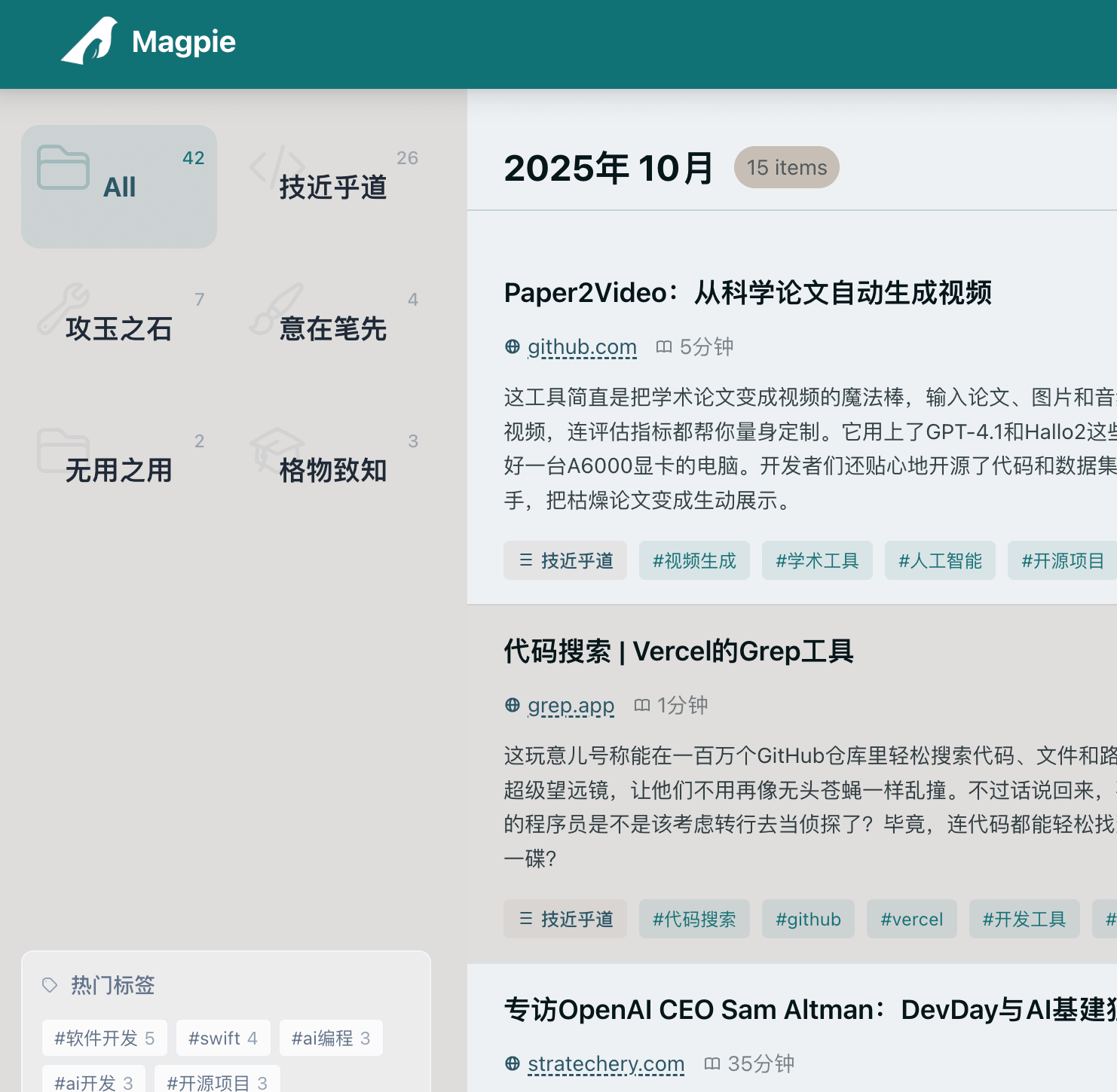 首先是驱动我个人链接收藏页面的 Magpie (喜鹊,没错我就是很喜欢用鸟来给项目命名的人),它是一个轻量级的链接收藏,后端接入 AI 模型,可以从链接 URL 中获取内容,自动提取标签以及合适的分类,甚至按需求写一些短评。你可以把它想成上个世代的各种 Read it later 服务的 AI 加强版,并且配套的管理后台、快捷指令和 Chrome 插件也都齐备了。